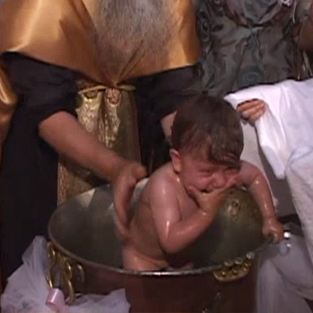 טקס טבילה ביוון: כהן הדת מברך את הבגד החדש ומלביש -אך את יתר המלתחה מלבישות האם והסנדקית